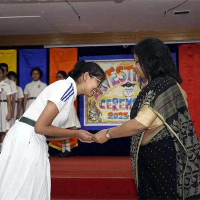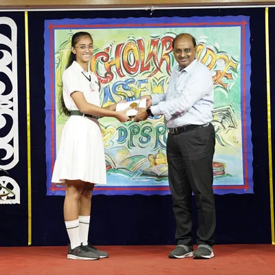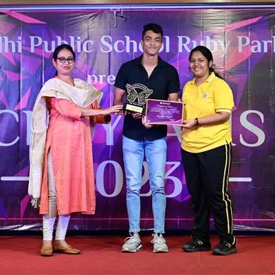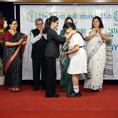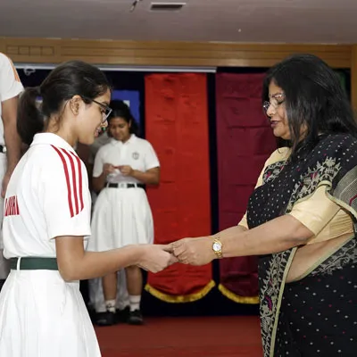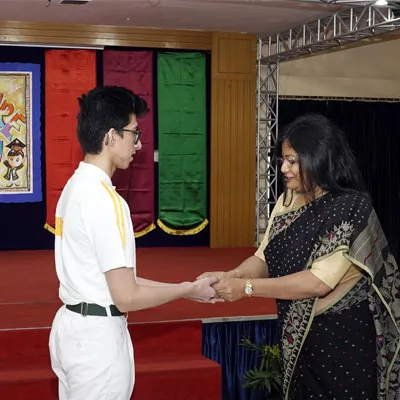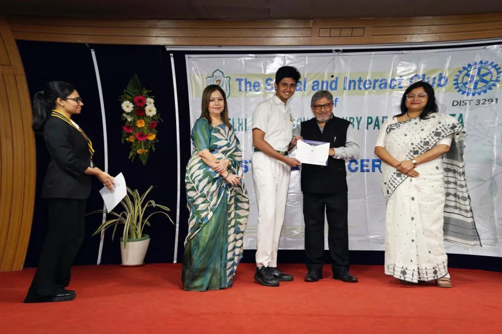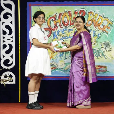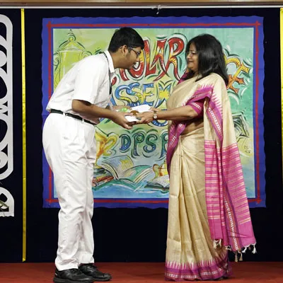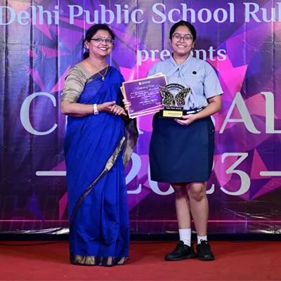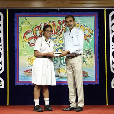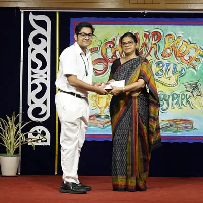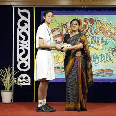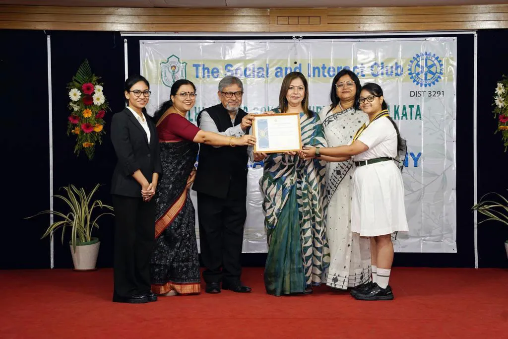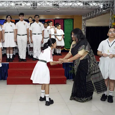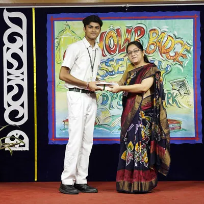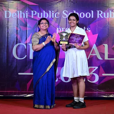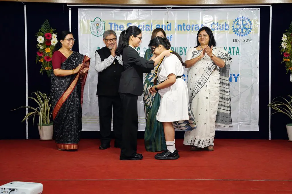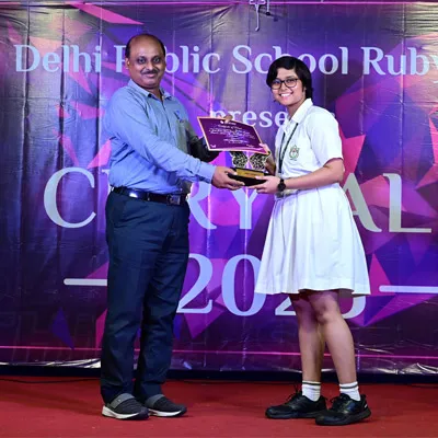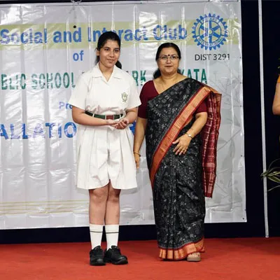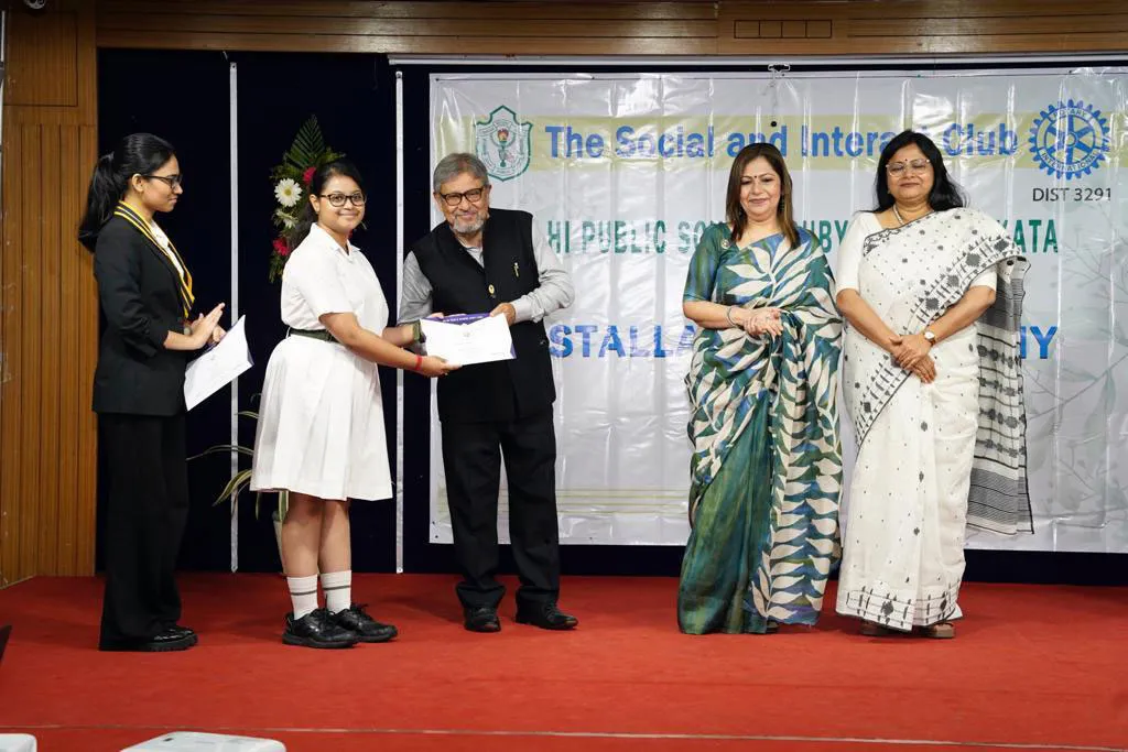 Outgoing President Of Social And Interact Club 2022 – 23 Of Dps Ruby Park Raina Das Receiving Her Certificate From Club Mentor Tapan Gooptu -